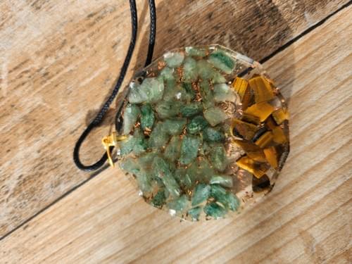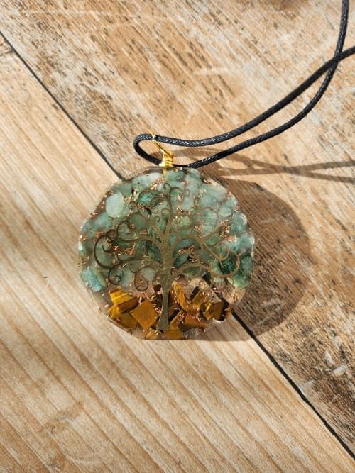 L'arbre de vie qui s'impose dans toutes les civilisations, la nature dans sa présentation puissante et parfaite. Ce pendentif est une orgonite avec des minéraux de jaspe et de l'œil de tigre. Ceci lui confère les vertus de la protection et de la prospérité. L'arbre de vie en lui même est la qualité de l'éveil, du temple intérieur, de la révélation de la divinité.